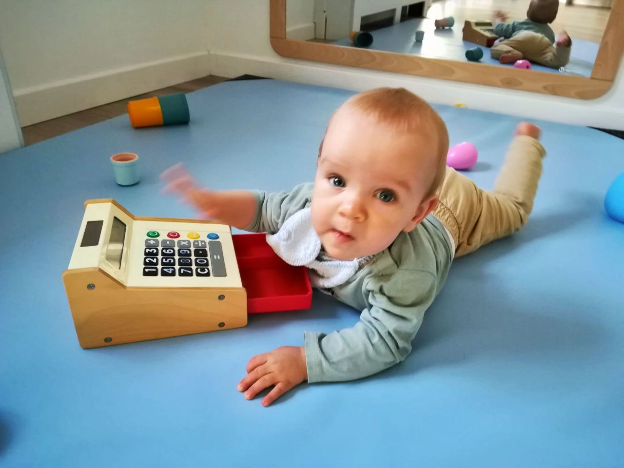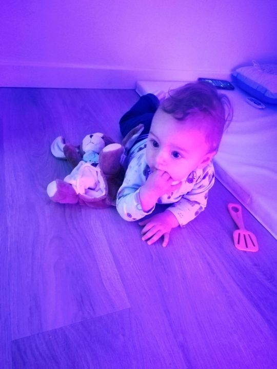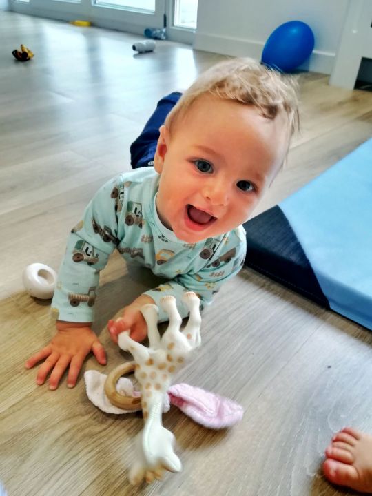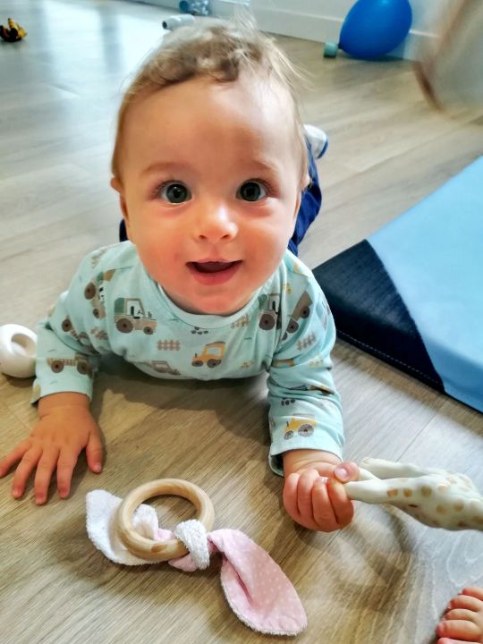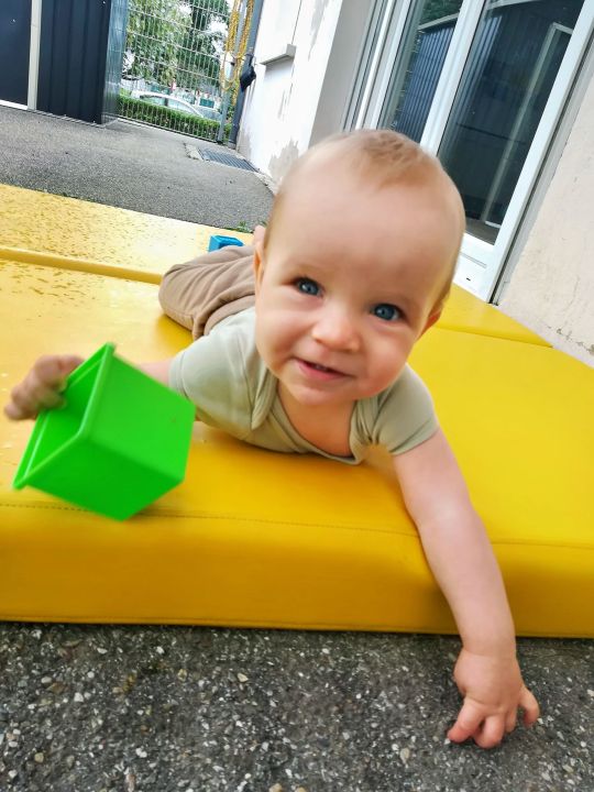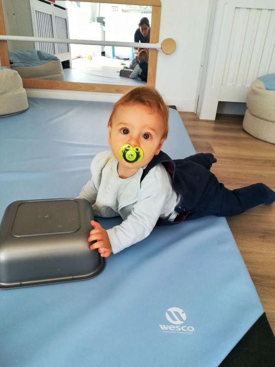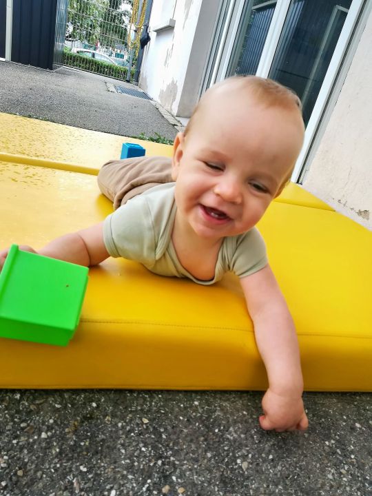Gael qui a rejoint le groupe des bébés depuis peu se mouvoit au sol et découvre la manipulation d'objets ainsi que la salle sensorielle qu'il apprécie beaucoup😊